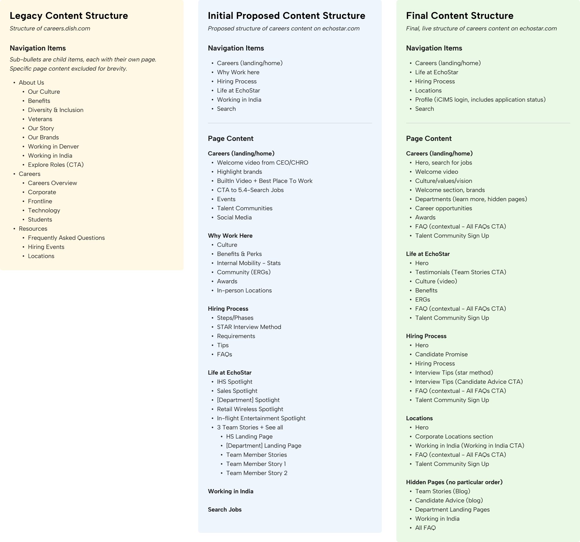Legacy, proposed, and final content structure outline