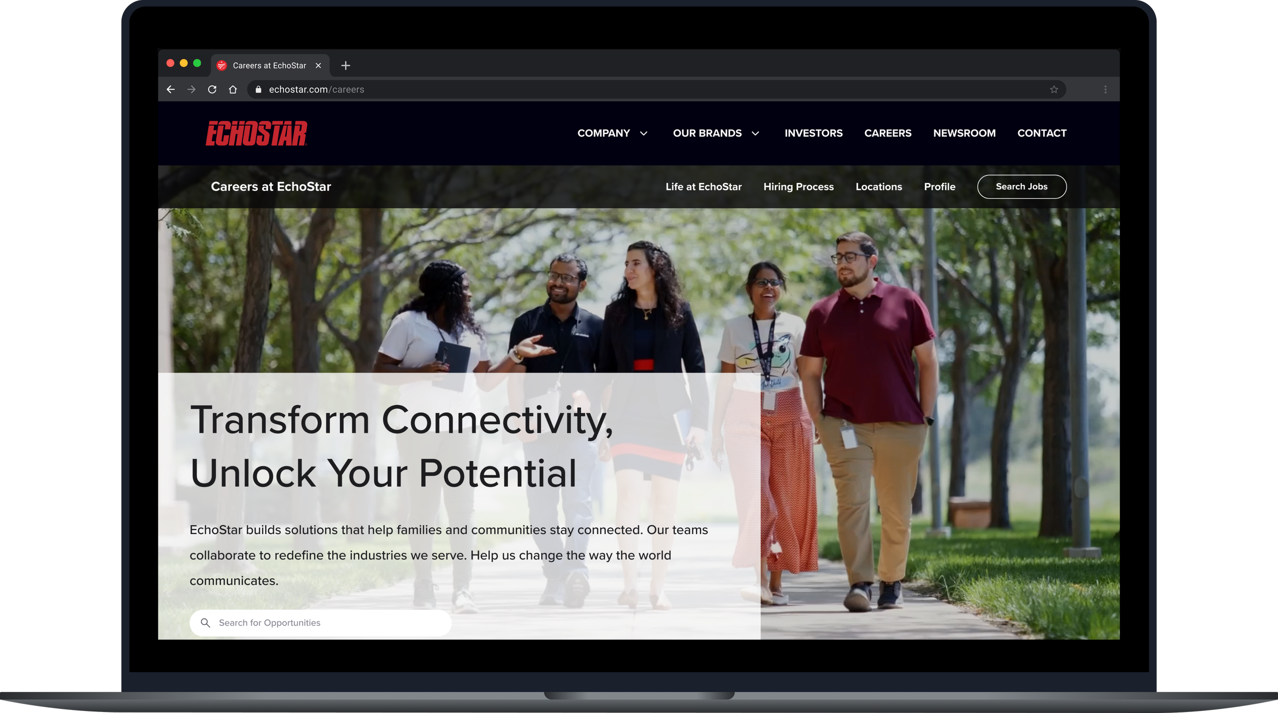 Inconsistent brand presence: Hughes, EchoStar’s flagship brand prior to the merger, had no dedicated careers site. Separately, DISH’s career site did not align with the new EchoStar corporate brand.